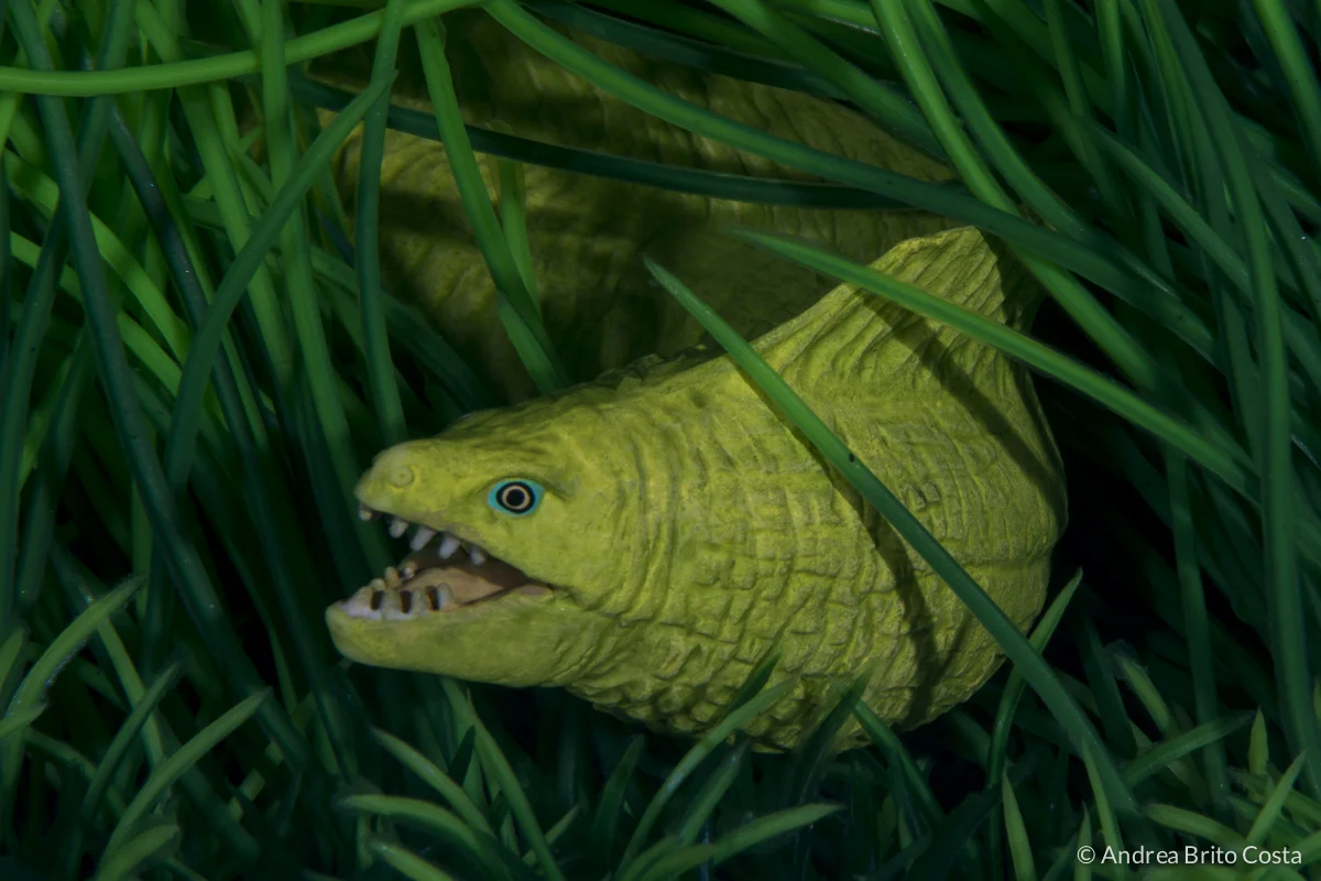 Mais um curso de foto sub individual, dessa vez com a Andrea Brito Costa. Andrea fotografa com uma Nikon D5300 em caixa Ikelite e 2 flashes Sea&Sea YS-D1. O curso foi bastante produtivo e escolhi essa foto que a Andrea fez dessa vaidosa moréia verde (Gymnothorax funebris). Repare na sombra azul que ela está usando nos olhos....
